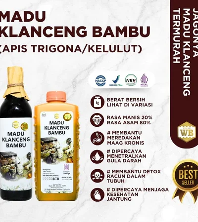 Madu Klanceng Bambu WB Wild Bee merupakan madu murni berkualitas tinggi yang dihasilkan dari lebah klanceng (Trigona spp.), salah satu jenis lebah tanpa sengat yang menghasilkan madu dengan kandungan enzim, propolis, dan antioksidan lebih tinggi dibanding madu biasa. Diproduksi secara alami tanpa bahan tambahan, Madu Klanceng WB Wild Bee cocok untuk menjaga daya tahan tubuh dan membantu pemulihan kesehatan.
