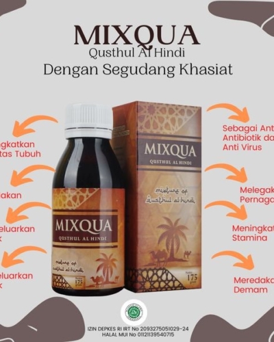 MIXQUA QUSTHUL AL HINDI merupakan 9 in 1 Herbal. Racikan ini menggabungkan Herbal Aktif Timur Tengah yaitu Qusthul Hindi, dengan Herbal Kekayaan Lokal Indonesia. Qusthul Hindi untuk batuk dan covid19 di Indonesia diperkenalkan oleh Ustadz Adi Hidayat