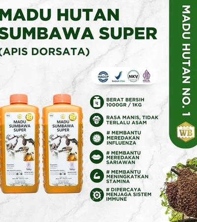 Paket Bundling 2 Pcs Madu Sumbawa Super WB Wild Bee 1KG adalah madu hutan murni berkualitas tinggi yang dihasilkan oleh lebah liar dari hutan tropis Sumbawa. Madu ini dikenal dengan rasa dan aroma khasnya yang kuat serta kandungan nutrisinya yang kaya. Setiap tetes Madu Sumbawa Super mengandung enzim, vitamin, dan mineral alami yang bermanfaat untuk menjaga daya tahan tubuh, membantu proses pemulihan, serta meningkatkan stamina harian.