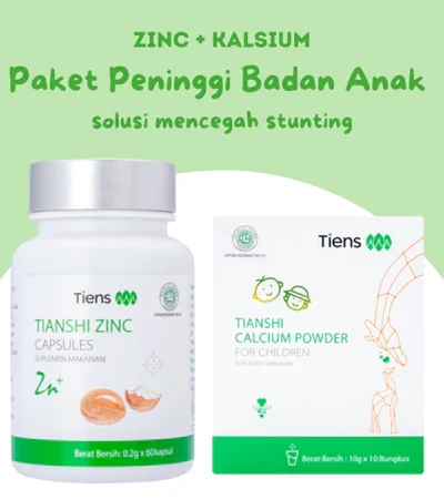 Produk Peninggi dan Nutrisi Anak Tiens merupakan kombinasi dua suplemen unggulan dari Tiens: Zinc Capsules dan Calcium for Children, yang diformulasikan khusus untuk membantu pertumbuhan tinggi badan, memperkuat tulang, serta menjaga daya tahan tubuh anak sejak usia dini.