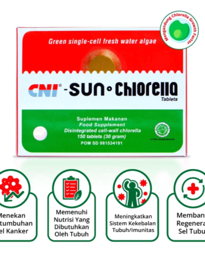 CNI Sun Chlorella adalah suplemen makanan alami yang terbuat dari mikroalga hijau Chlorella pyrenoidosa, sumber nutrisi padat gizi yang telah dikenal luas karena manfaatnya bagi kesehatan. Mengandung asam amino esensial, vitamin, mineral, antioksidan, klorofil, dan CGF (Chlorella Growth Factor), Sun Chlorella membantu tubuh mendapatkan asupan nutrisi lengkap untuk regenerasi sel dan daya tahan optimal.