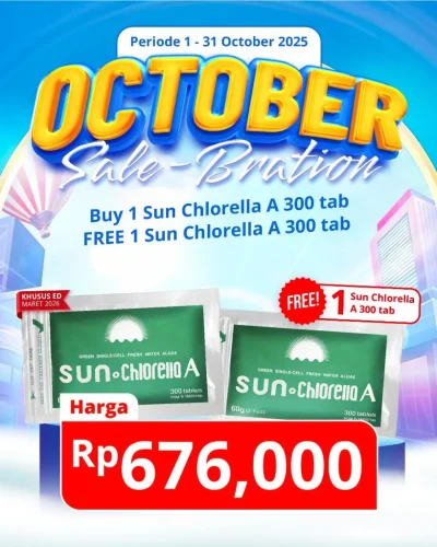 Nikmati penawaran spesial Buy 1 Get 1 Free untuk Sun Chlorella A 300 Tablet, suplemen superfood alami yang kaya akan nutrisi lengkap untuk mendukung kesehatan tubuh secara menyeluruh. Diformulasikan dari Chlorella pyrenoidosa, sejenis ganggang hijau tunggal yang terkenal sebagai sumber gizi super, produk ini membantu menjaga vitalitas dan keseimbangan sel tubuh Anda setiap hari.