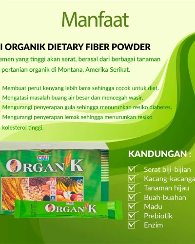 CNI Organik Dietary Fiber Powder adalah suplemen serat alami yang diformulasikan dari berbagai tanaman organik pilihan hasil pertanian di Montana, Amerika Serikat. Mengandung kombinasi serat dari biji-bijian, kacang-kacangan, tanaman hijau, buah-buahan, serta diperkaya dengan madu, prebiotik, dan enzim alami, menjadikannya solusi lengkap untuk menjaga kesehatan pencernaan dan mendukung program diet sehat Anda.